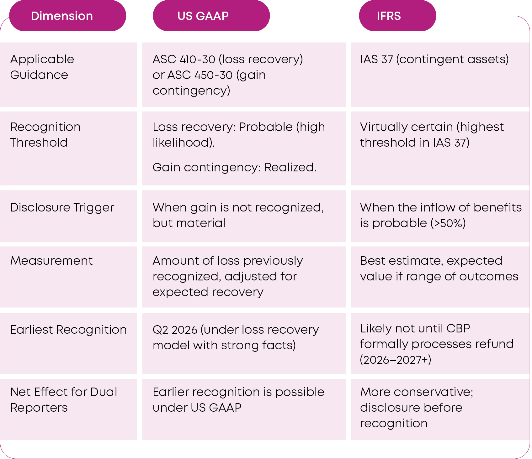For multinational groups, the divergence between US GAAP and IFRS recognition creates a real reconciliation challenge. We advise dual-reporting entities to align their disclosure strategies, even if recognition timing differs—ensure that the narrative in both sets of financial statements tells a consistent story, and that the reconciliation between US GAAP and IFRS explicitly addresses the timing difference in the tariff refund.
