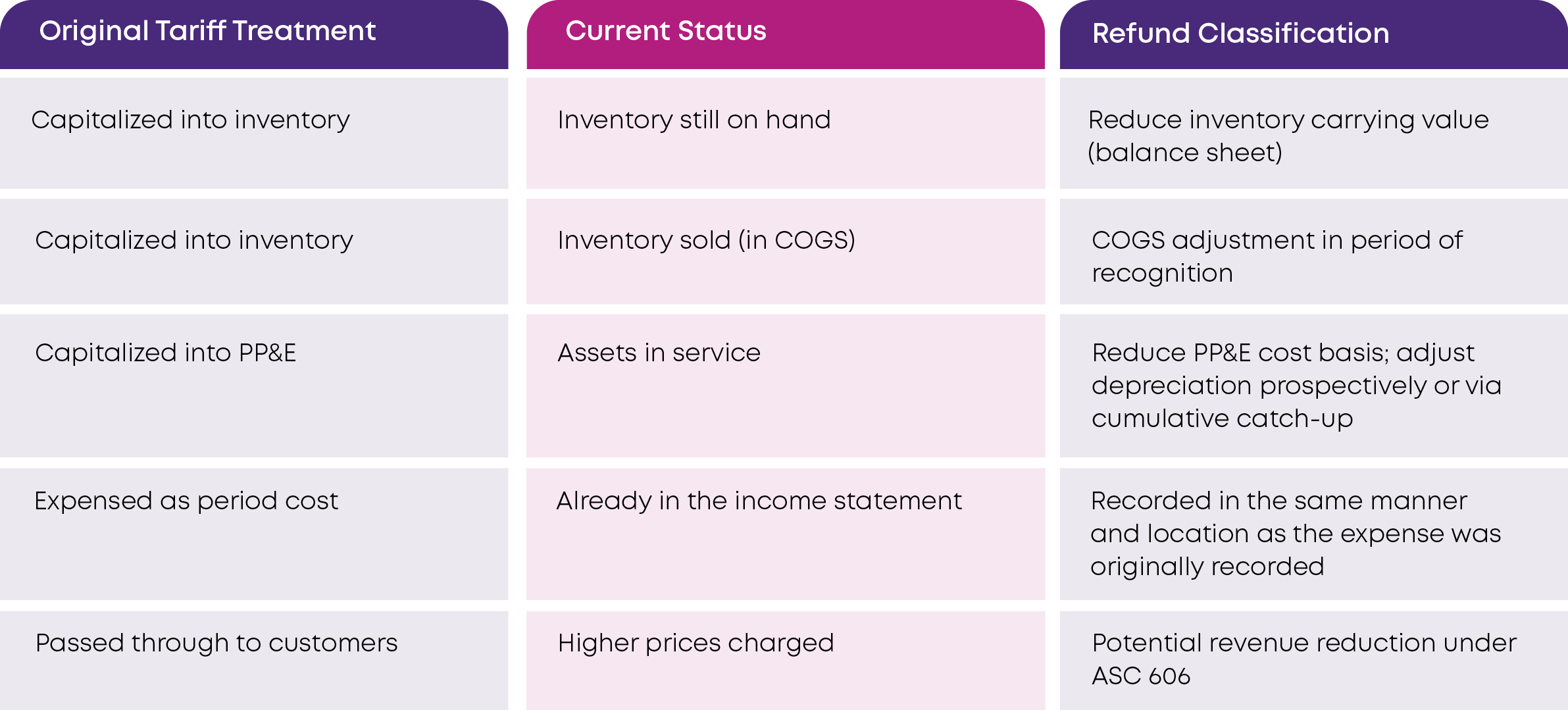 - Trace the refund to financial statement line items: Map each tariff payment to its current financial statement location (inventory, COGS, PP&E, period expense). This determines where the refund credit will land.