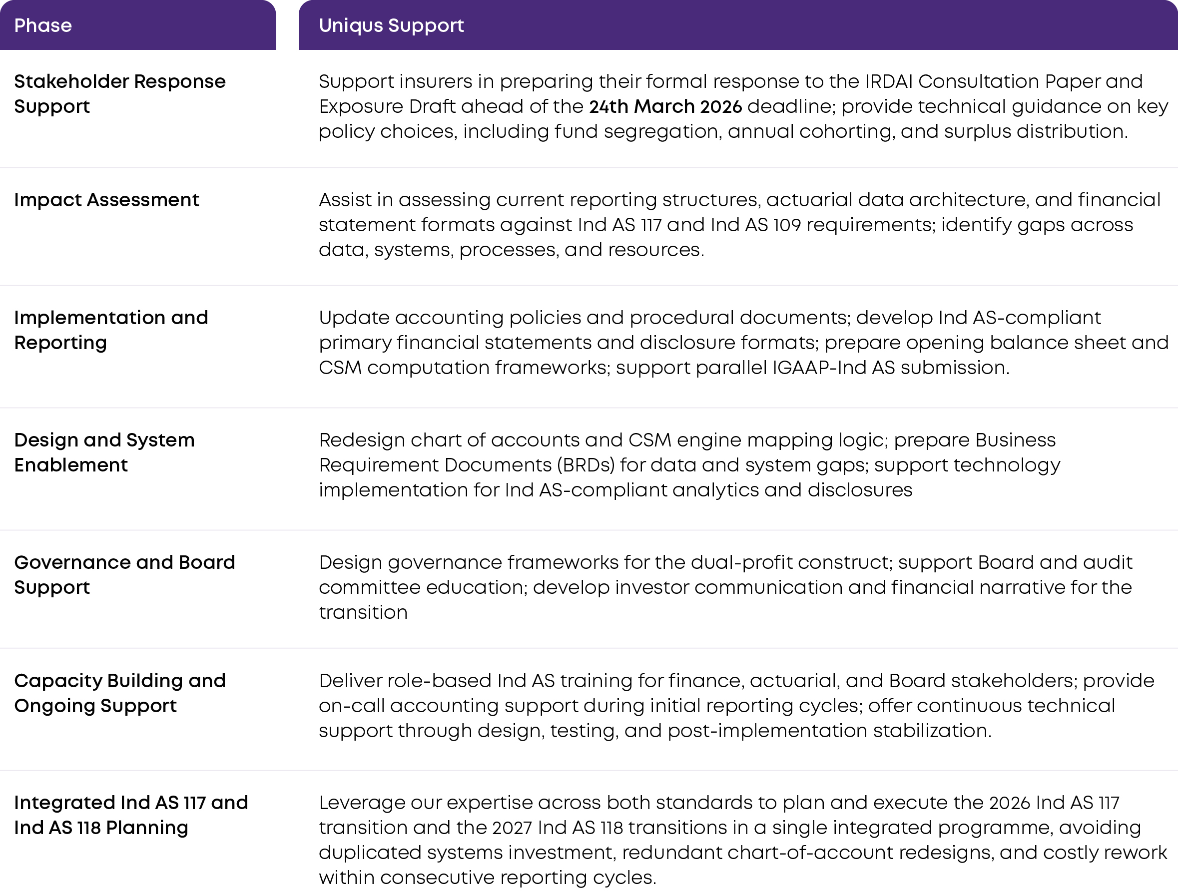 The proposed implementation is uniform: all insurers, regardless of size, listing status, or business mix, shall adopt Ind AS from 1st April 2026. During the first year, insurers will be required to submit both Ind AS financial statements (statutory reporting) and Indian GAAP-based financial information (special-purpose regulatory submission) in parallel, enabling a rigorous impact assessment of the transition.