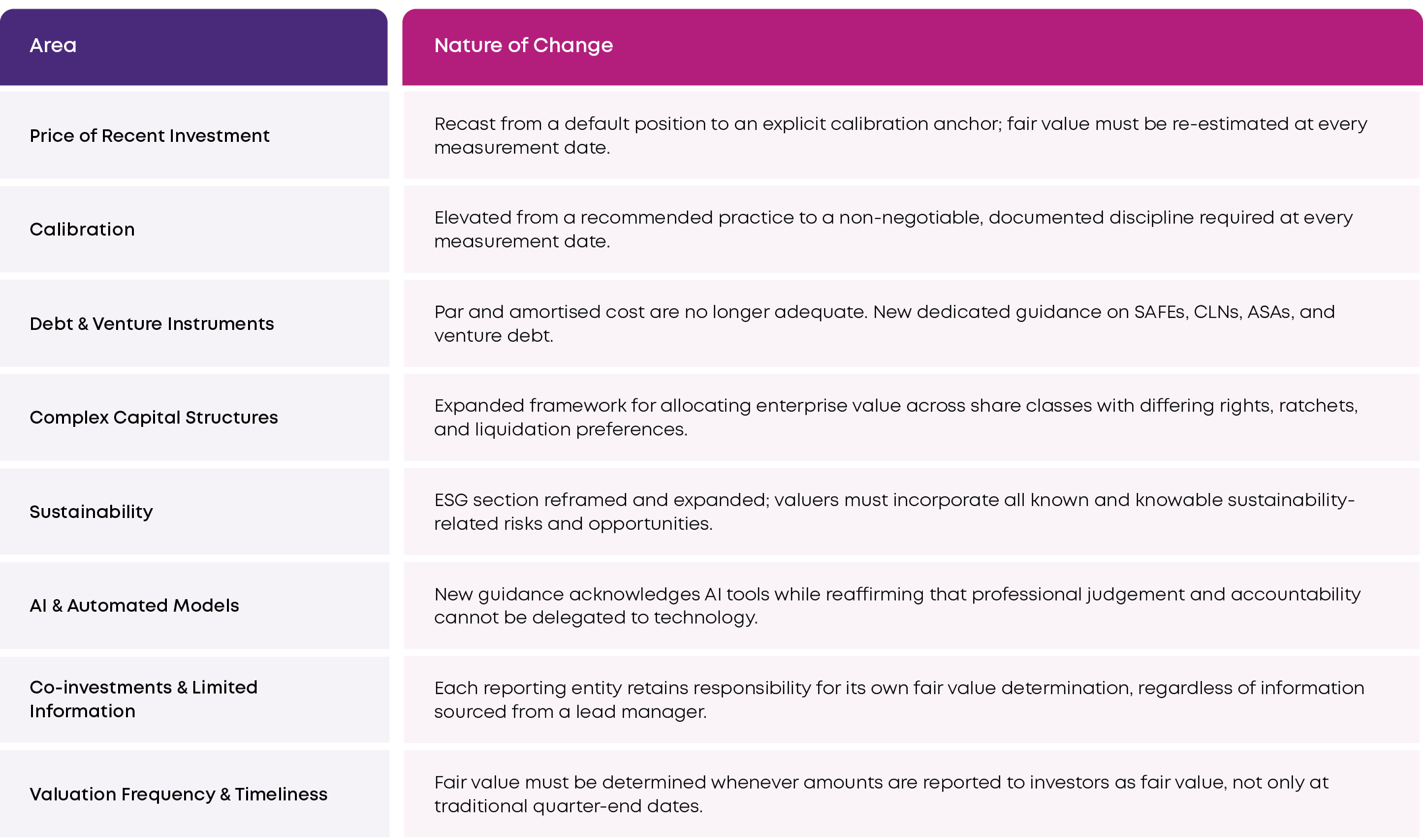 A new dedicated section addresses venture debt and convertible instruments — including SAFEs, convertible loan notes (CLNs), and advance subscription agreements (ASAs). These instruments are increasingly prevalent in venture and growth equity portfolios, yet have not previously received detailed treatment in the Guidelines. The 2025 edition provides direction on calibrating initial fair value to transaction terms, separating debt and equity components where relevant, and updating valuations as credit quality, optionality, and market benchmarks evolve. For many valuation teams, this will represent a material change in the depth of analysis applied to instruments that have historically been carried at cost or face value.