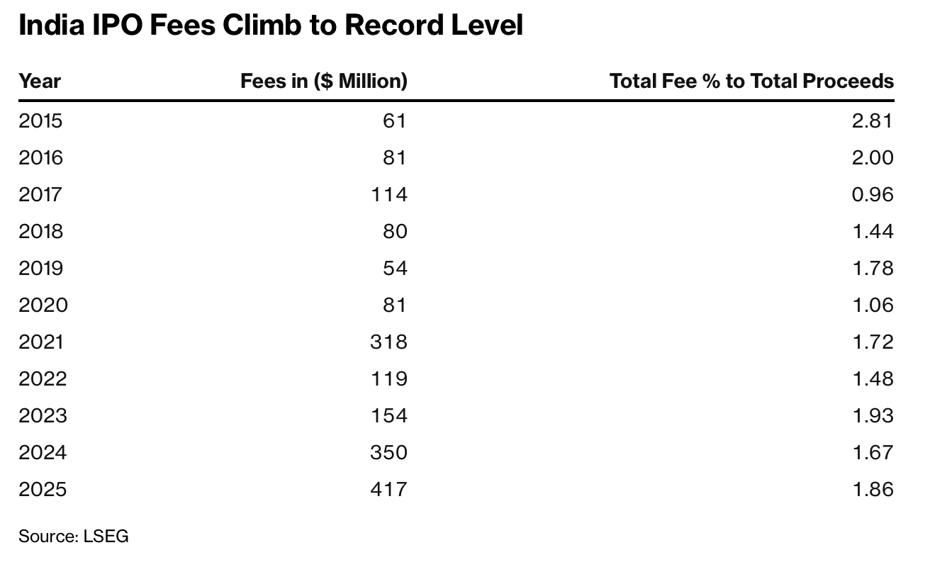The fee increase came as first-time share sales in India climbed to an all-time high for a second straight year, thanks to a a swelling base of retail investors and steady institutional appetite, as well as regulatory efforts to make it easier for firms to list. The higher income also indicates a maturing local capital market, with companies willing to pay more for value-added service rather than basic deal execution, bankers say.
