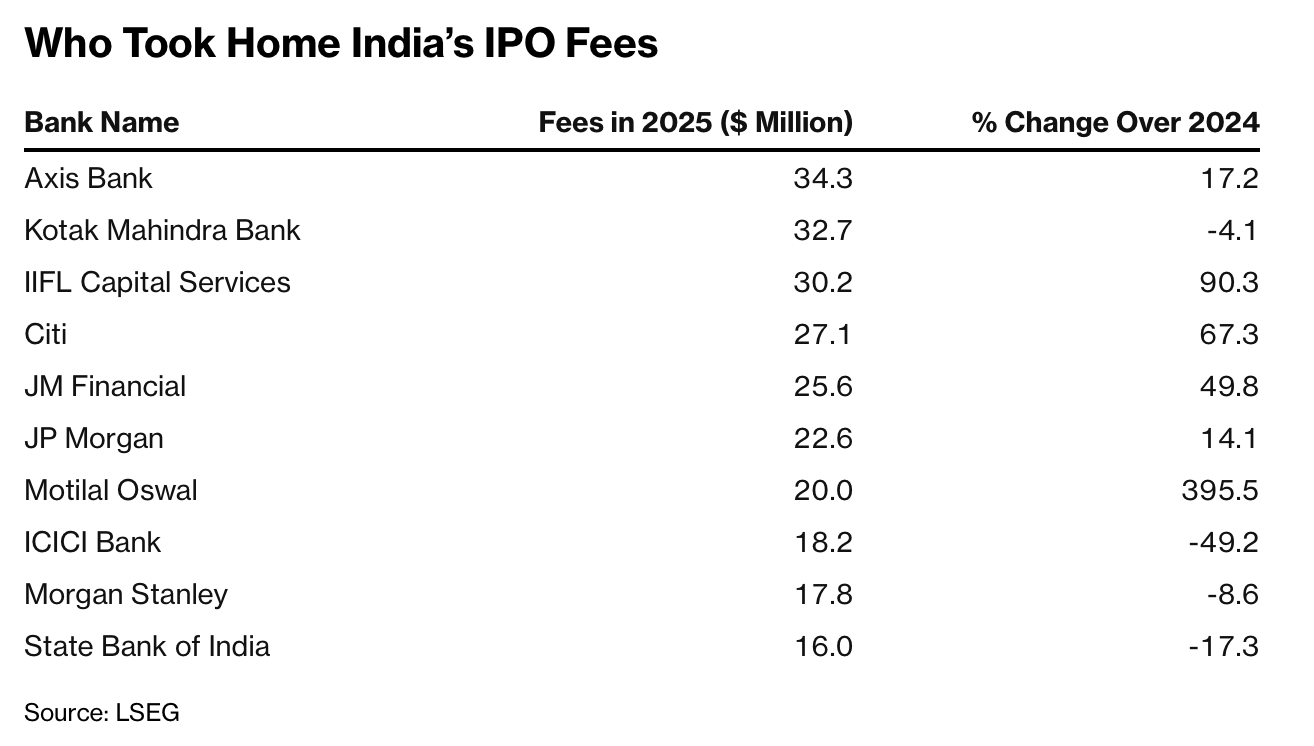 Axis Bank led the pack of IPO advisors, pocketing $34.3 million of underwriting fees, followed by Kotak Mahindra Bank Ltd. with $32.7 million. Other strong performers include IIFL Capital Services Ltd., whose fee income jumped 90% last year. Motilal Oswal Financial Services Ltd. posted a 396% surge.
