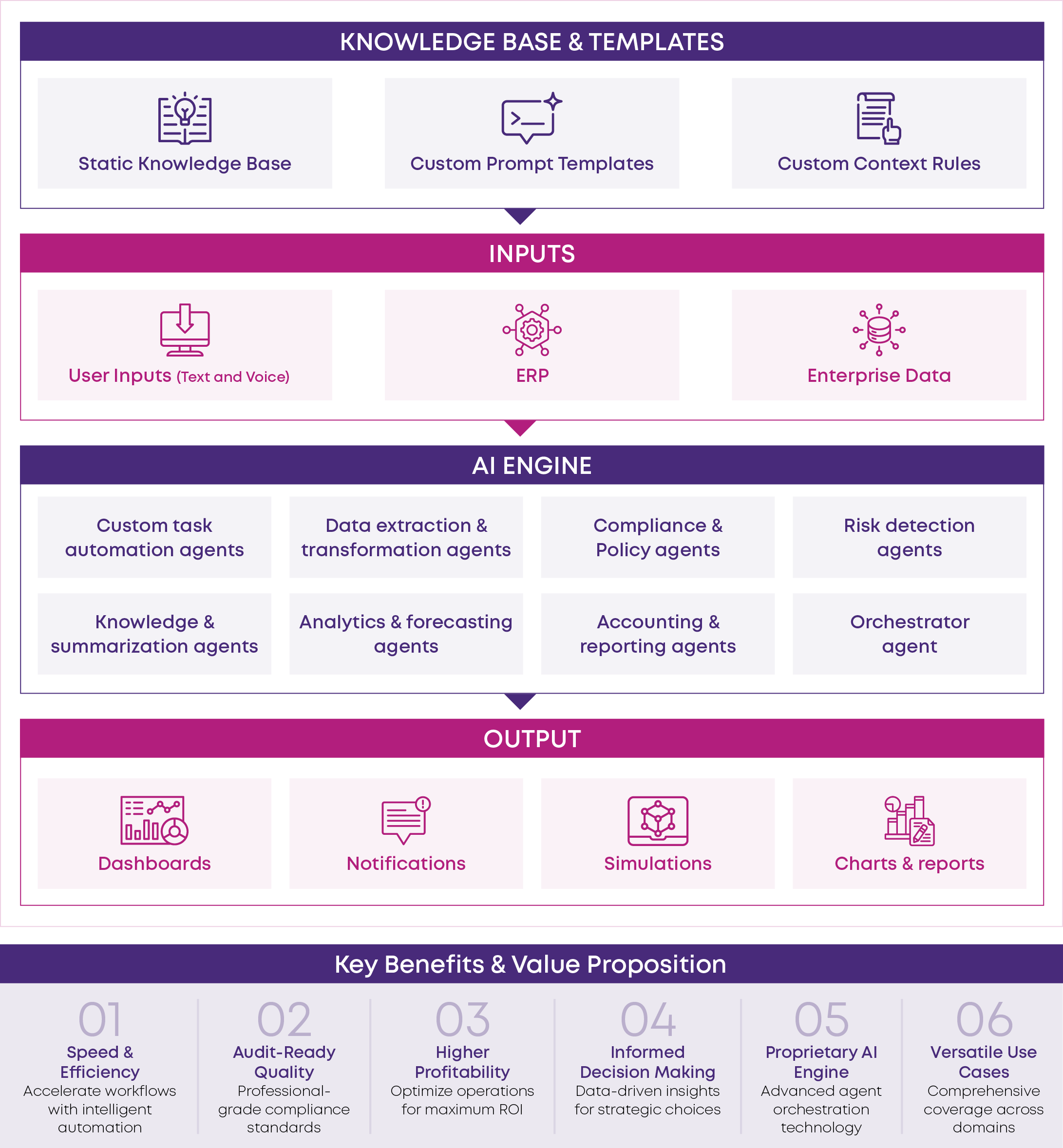 By combining deep functional knowledge with technical expertise in AI, we have built a framework for tackling enterprise use cases. Our solution architecture leverages our proprietary agent library spanning automation, data, accounting, risk, compliance, and analytics. This framework can be customized to match each organization’s data inputs, output requirements, and business goals.